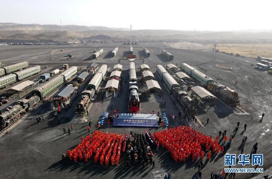 寧夏中衛(wèi)市寧夏鋼鐵集團(tuán)“時(shí)代光耀”老火車博物館,“雷鋒號(hào)”機(jī)車揭幕紀(jì)念儀式現(xiàn)場。(3月5日攝,無人機(jī)照片)